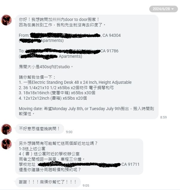在通话中,王小姐除了说明搬家的时间压力与物品内容外,也提出了一个特殊需求:这次搬家需要分送至两个不同的地址。这两个地址彼此距离仅约 1 英里,车程大约 3 分钟,但因为实际居住与存放需求不同,必须精准分配与配送。168moving 的业务人员耐心聆听后,针对分送两个地址的流程进行详细说明,协助王小姐确认每一箱物品该送往哪一个地点,避免混乱或遗漏。